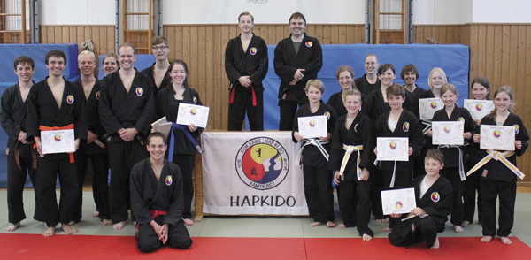 Am ersten Adventswochenende traten elf Kinder und Jugendliche und ein Erwachsener zur Gürtelprüfung im Winterhalbjahr an. Acht Prüflinge zeigten schöne Tritte, kräftige Schläge und eine saubere Fallschule und schafften den Sprung vom weißen zum gelben Gürtel. Hierzu gratulieren wir Valentina Block, Aleksa Draskovic, Luisa Hagen, Lucia Loth, Philip Pollklesener, Tim Sanhüter, Daniel Schmeiser und Tammy Bhornbijja! Besonders freut uns, dass Tammy, die ihr Austauschjahr am örtlichen Gymnasium verbringt, sich ihren Gastgeschwistern angeschlossen hat und am Hapkido Training teilnimmt. Nun kann sie stolz den Gelbgurt mit zurück nach Thailand nehmen.